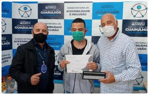 Dois alunos com deficiência visual do projeto Práticas Educativas para Inclusão Social (Peis) receberam na manhã desta segunda-feira (14) os certificados pela conclusão do curso online de soroban, nome dado ao ábaco japonês utilizando por pessoas com deficiência para realizar cálculos. Esta foi a primeira turma online, já que o curso, oferecido pela Secretaria de Direitos Humanos (SDH) de Guarulhos, precisou ser adaptado por conta da pandemia.