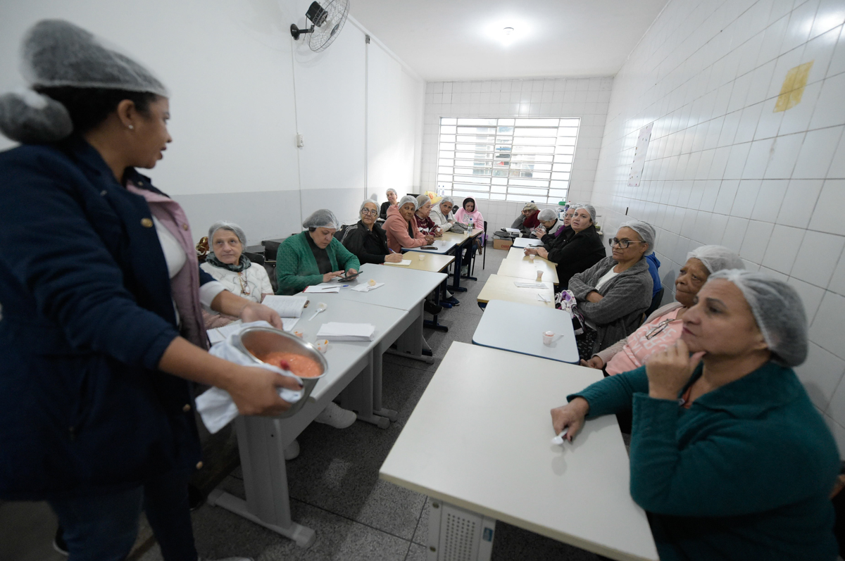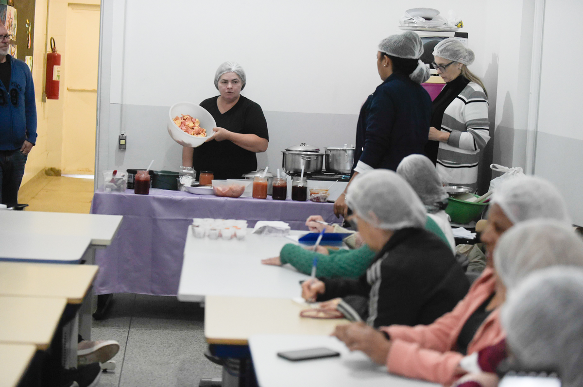 Atenta e anotando todas as orientações e informações em seu caderno, Bárbara Maria Fiorante, de 71 anos, faz bolos, doces e salgados sob encomenda. “Estou adorando a aula. Sou aplicada e persistente. Compotas será mais uma opção para eu preparar e vender. Gosto de oferecer novidades aos meus clientes”, contou a moradora do Bom Clima.