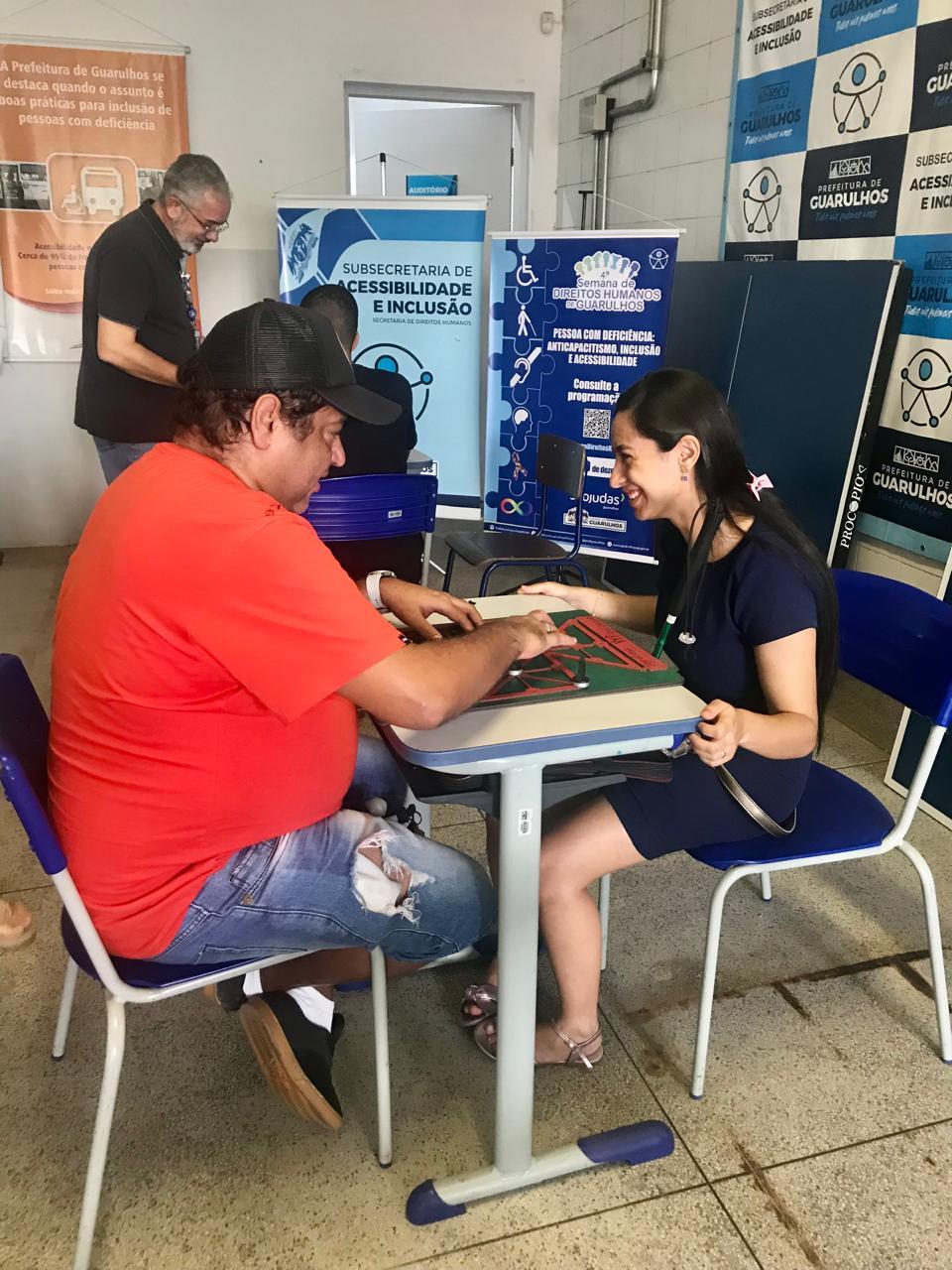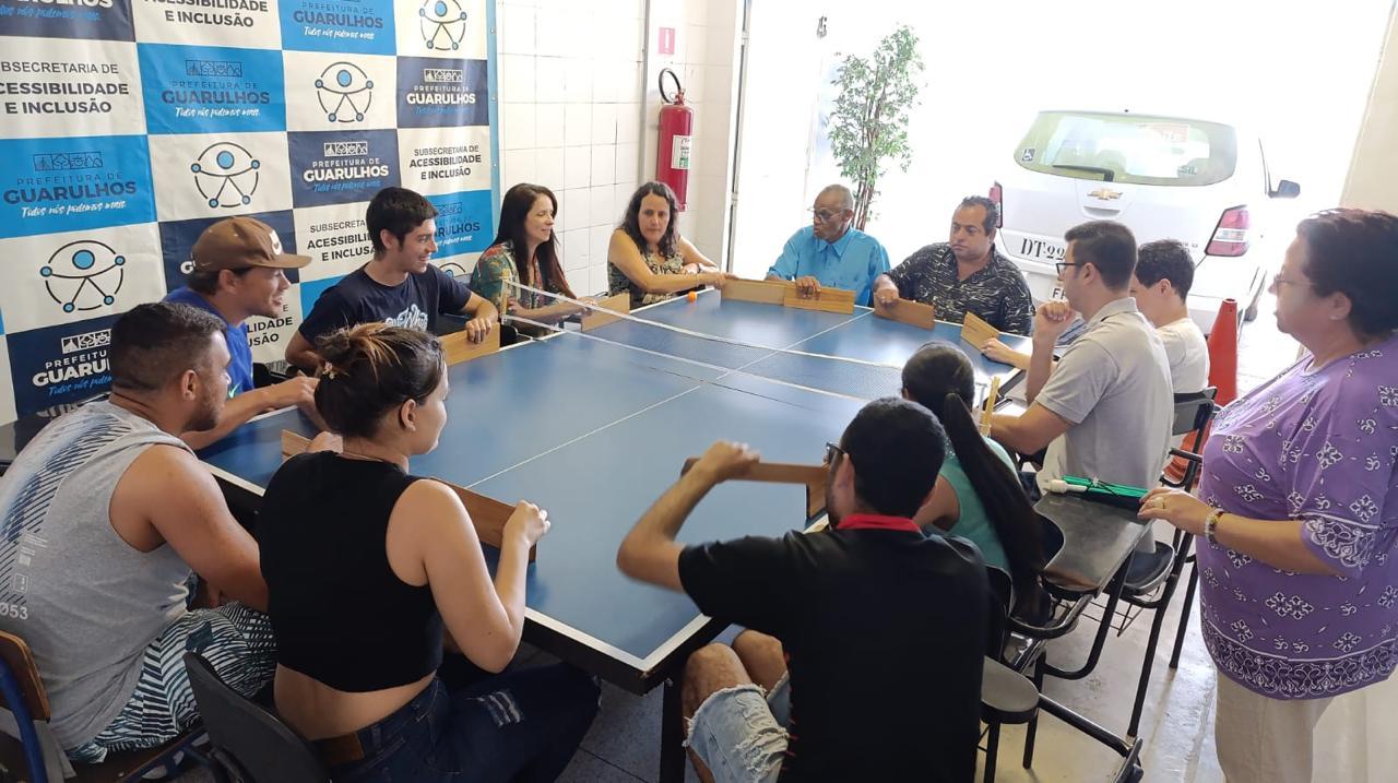Alunos com deficiência visual do projeto Práticas Educativas para Inclusão Social, promovido pela Prefeitura de Guarulhos, participaram nesta segunda-feira (9) da oficina “Trabalhando a Ansiedade por Meio de Jogos Adaptados” na sede Subsecretaria de Acessibilidade e Inclusão, no Macedo. A iniciativa fez parte da programação gratuita da 4ª Semana de Direitos Humanos (https://bit.ly/4SemanaDHGru), que acontece em diversos locais da cidade até o dia 10.