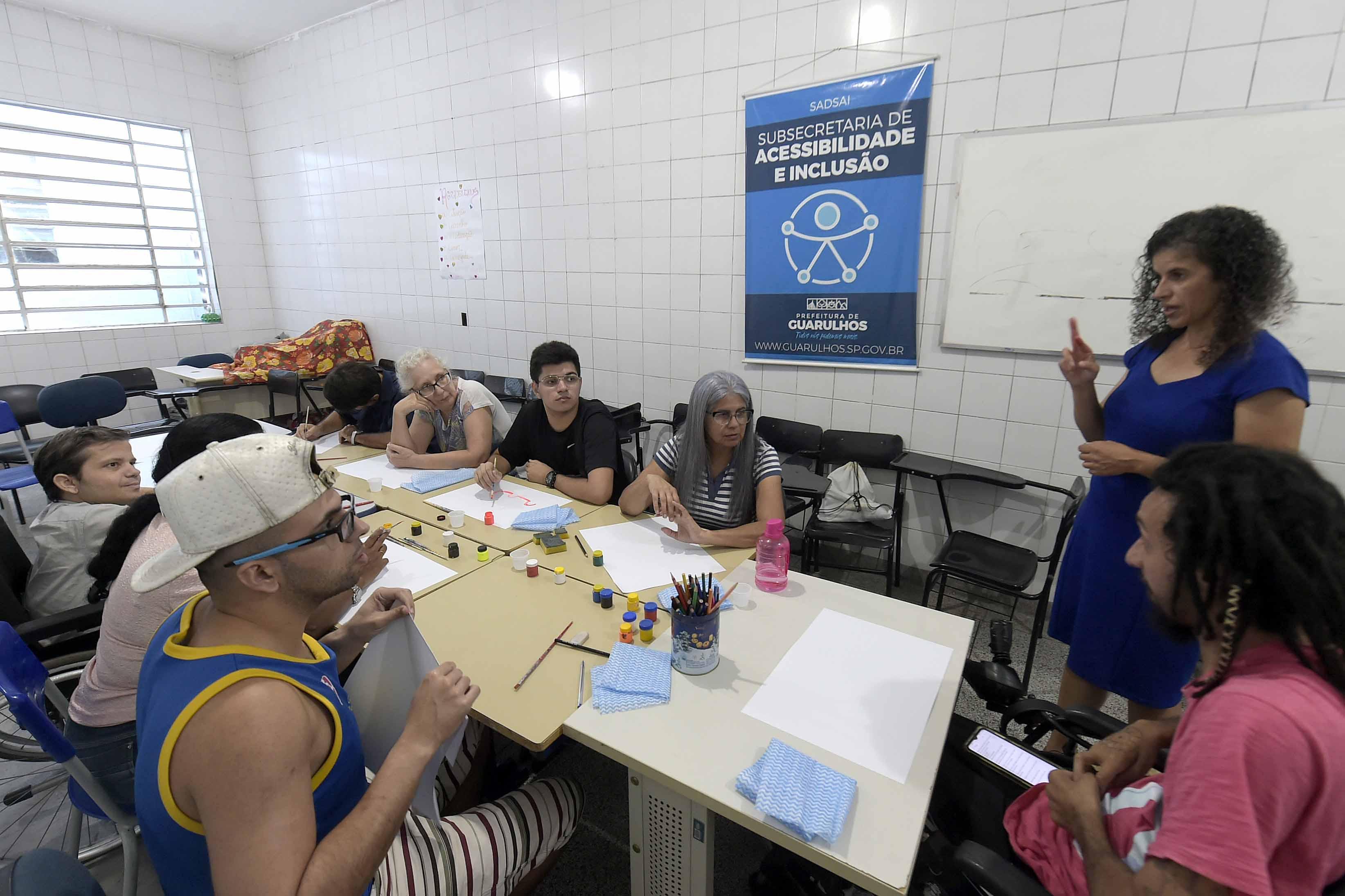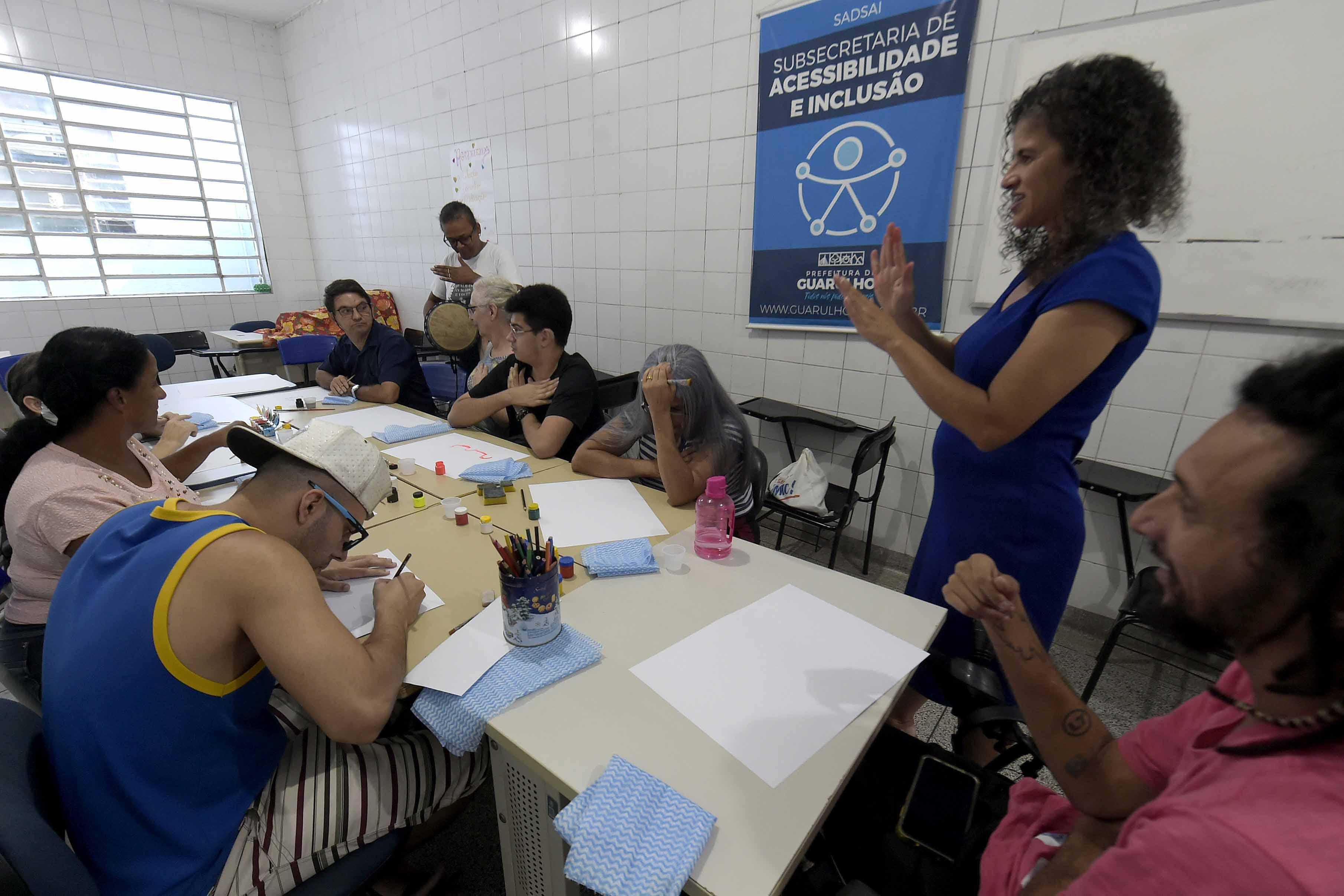 Nesta quinta-feira (27) uma turma de pessoas com deficiência auditiva participou da oficina de pintura Cores da Inclusão, promovida pela Prefeitura de Guarulhos, na qual puderam soltar a imaginação para expressar seus sentimentos e emoções por meio da arte. A ação da Subsecretaria de Acessibilidade e Inclusão foi conduzida pelo artista plástico Ricardo Almeida.