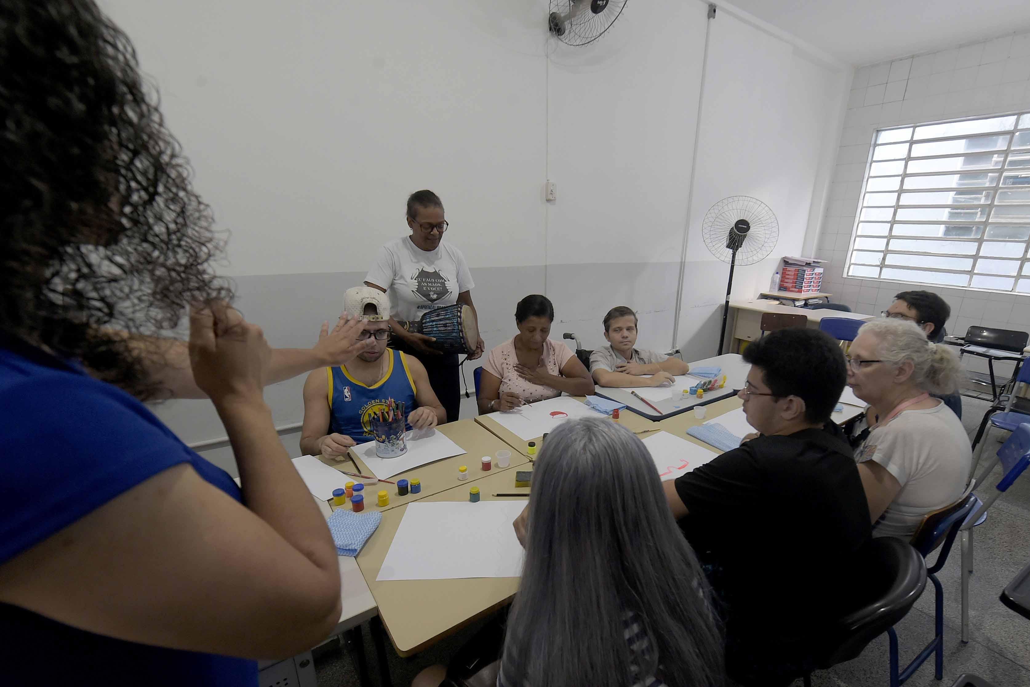 Duas intérpretes de Libras da pasta auxiliaram os participantes, que, de olhos fechados, sentiram a pulsação do coração com as mãos no peito e depois a vibração do djembe, o tambor africano. “Com as vibrações o grupo irá buscar um sentimento para colocar na folha de papel em branco. A arte hoje vai ultrapassar a barreira da comunicação e os surdos vão se expressar pela pintura”, explicou Ricardo, que é deficiente físico há mais de 17 anos e vive da comercialização de suas obras.