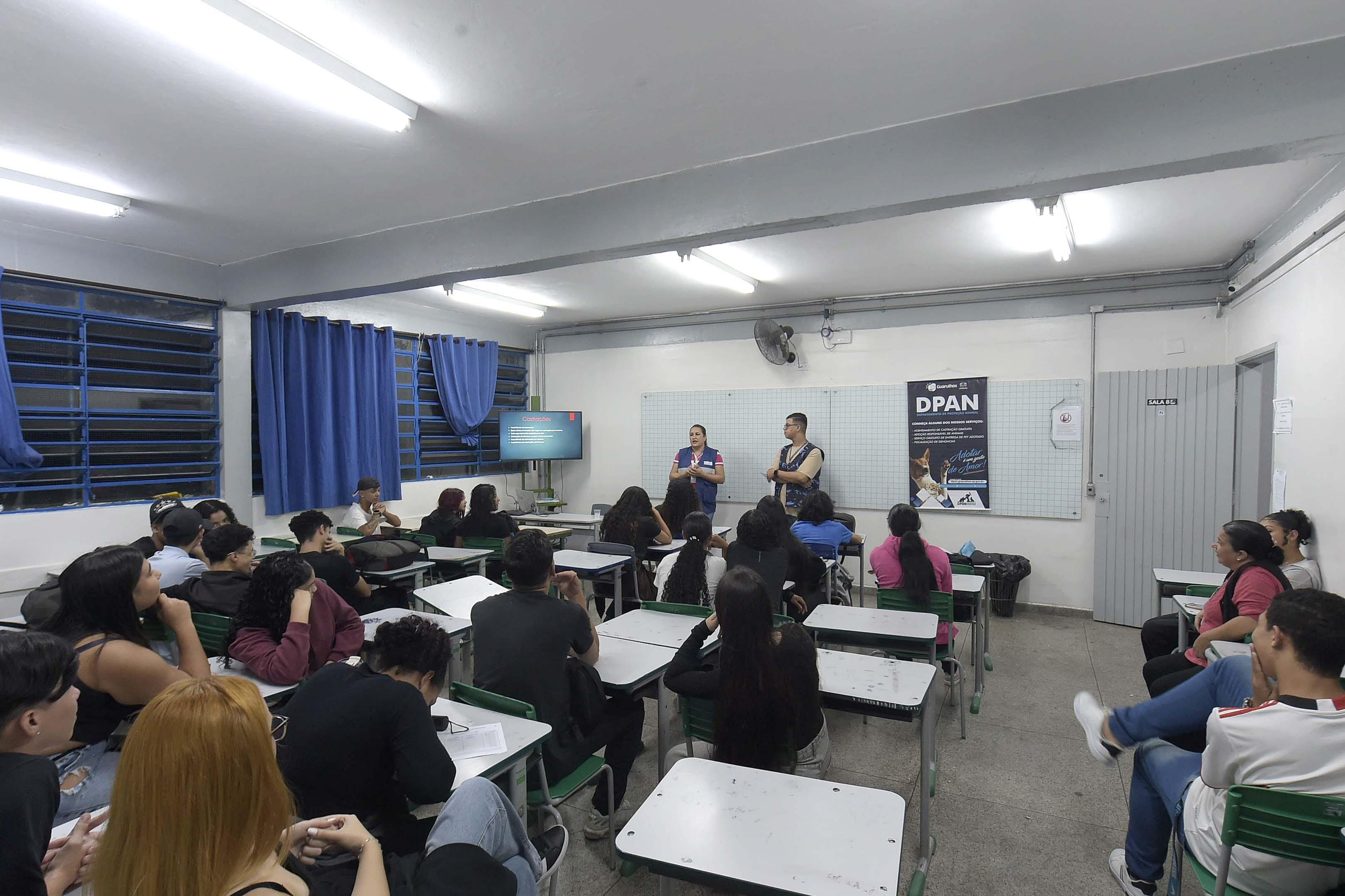A Prefeitura de Guarulhos promoveu na noite de quinta-feira (24) o projeto Juventude na Escola para cerca de 300 alunos do ensino médio da E.E. Deputado José Storopoli, no Jardim Santa Terezinha, região da Cidade Soberana. Coordenada pela Subsecretaria da Juventude (SJ), integrante da Secretaria de Direitos Humanos, a proposta é oferecer aos jovens, na própria instituição de ensino, atividades, oficinas e palestras com orientações e informações sobre acessibilidade, saúde mental, cidadania, empregabilidade, além de atividades culturais.